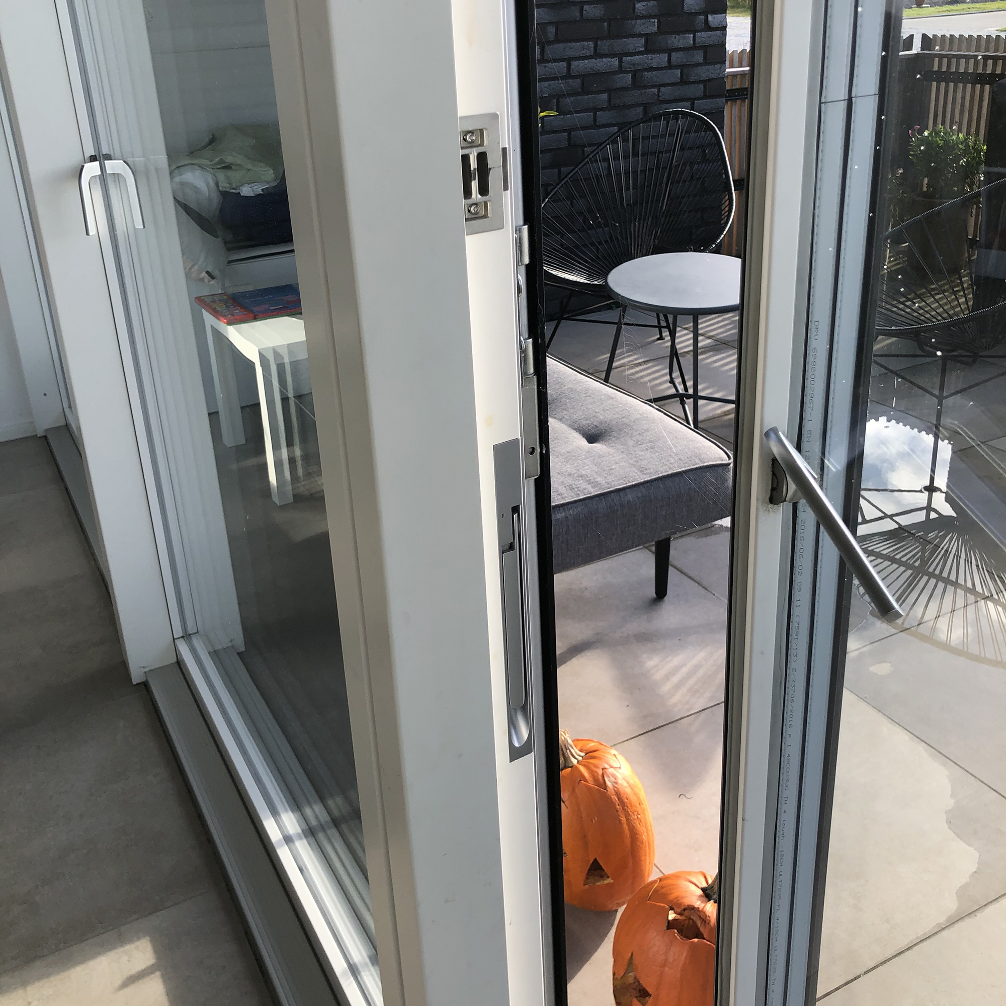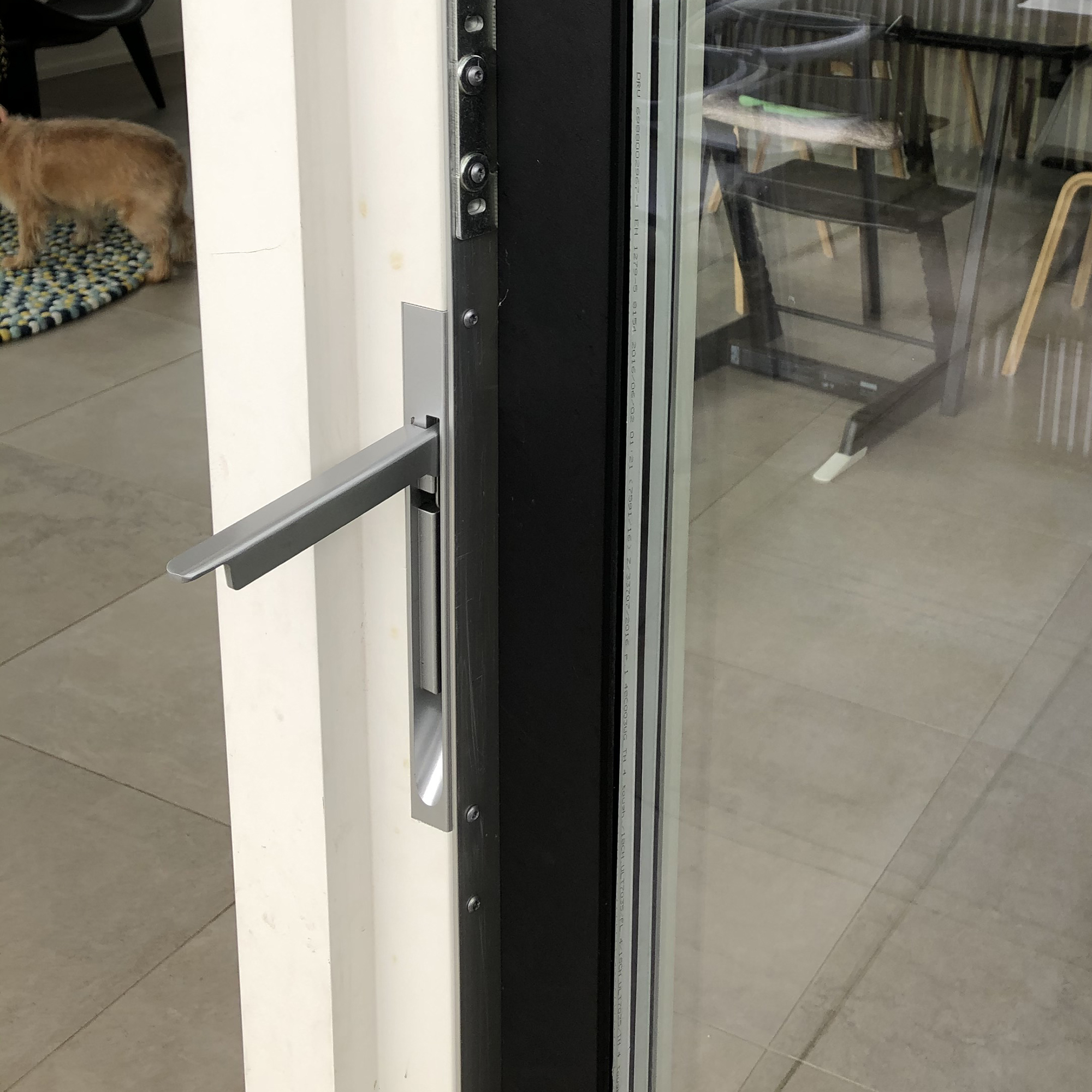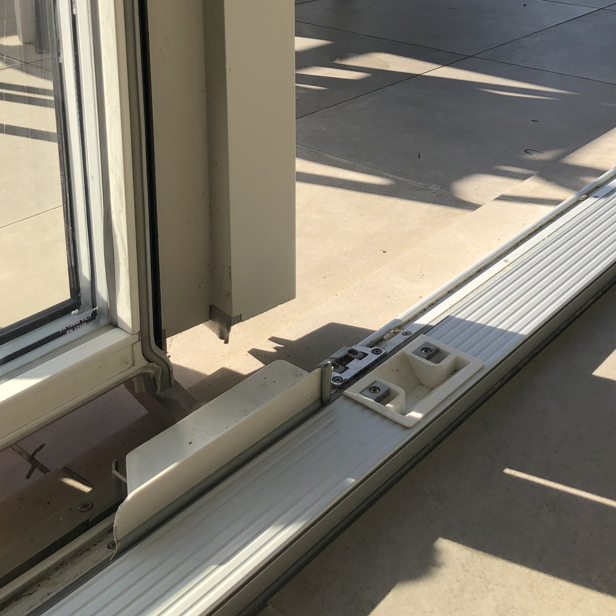 There are Visible sliding trucks and guide rails beneath the sliding casement door at its entire length, and beneath eventual matching sidelights – please review image in Fittings section.
