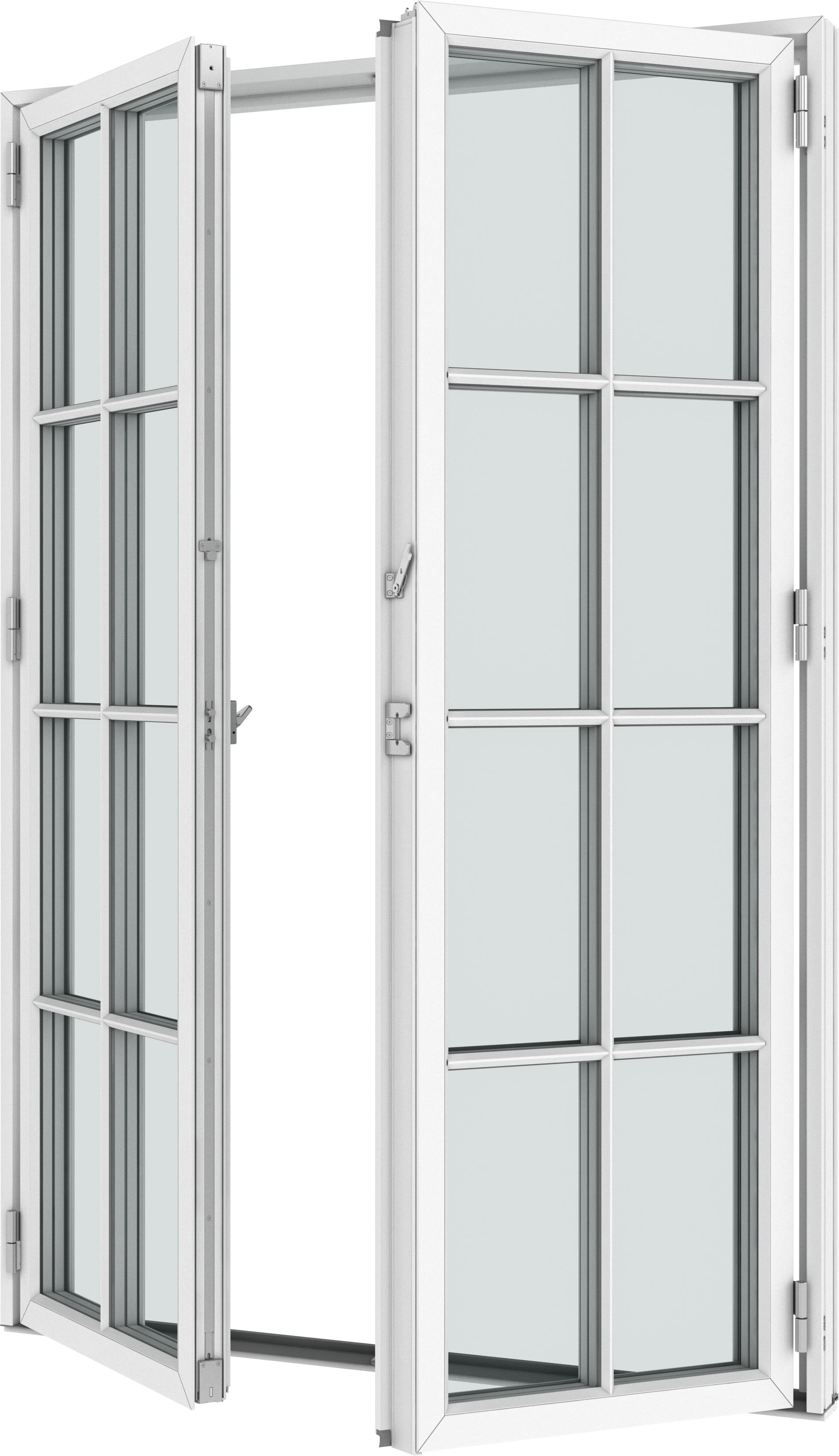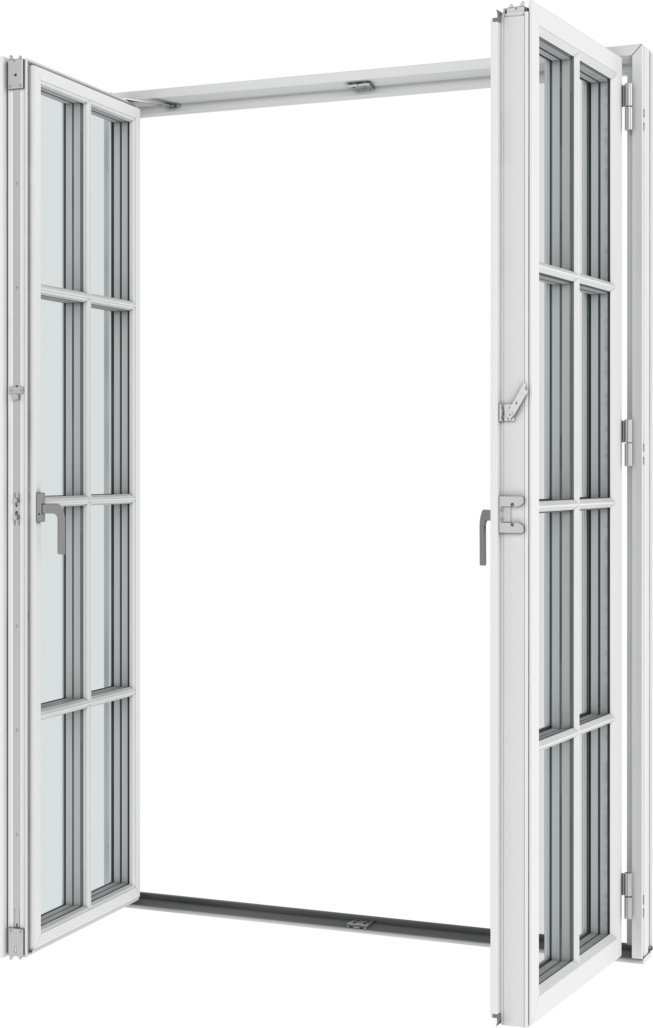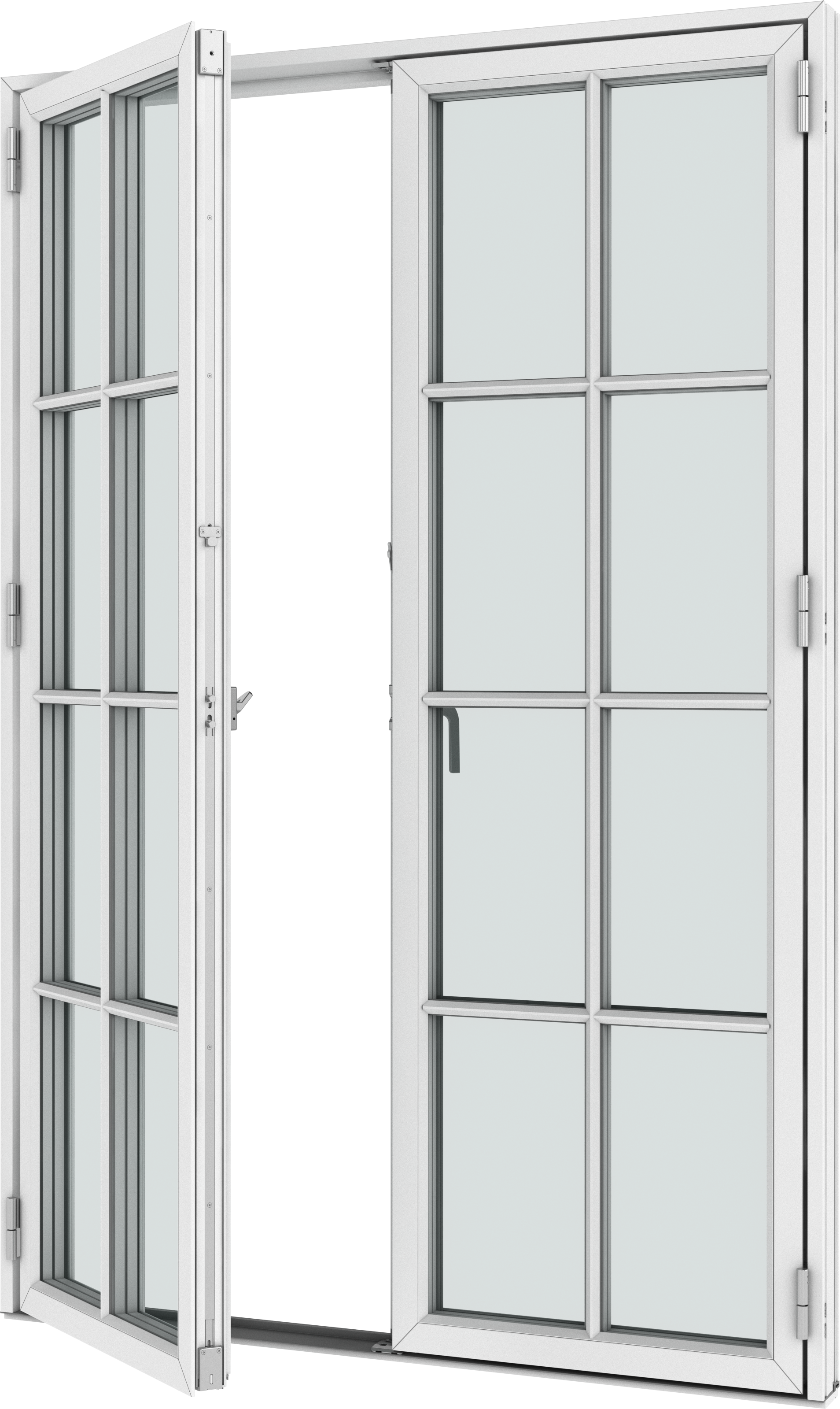 - Two espagnolette handles with handle operated brake, which can keep the door open in a random position under calm weather conditions (not possible with 180° hinges).
